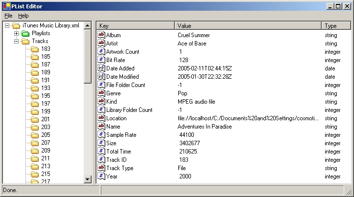 I have been working on reading the iTunes library files and such using XML and decided to write an Apple PList editor for Windows. I have a completely working copy that works read-only for now. Here is a screen shot of my latest creation: